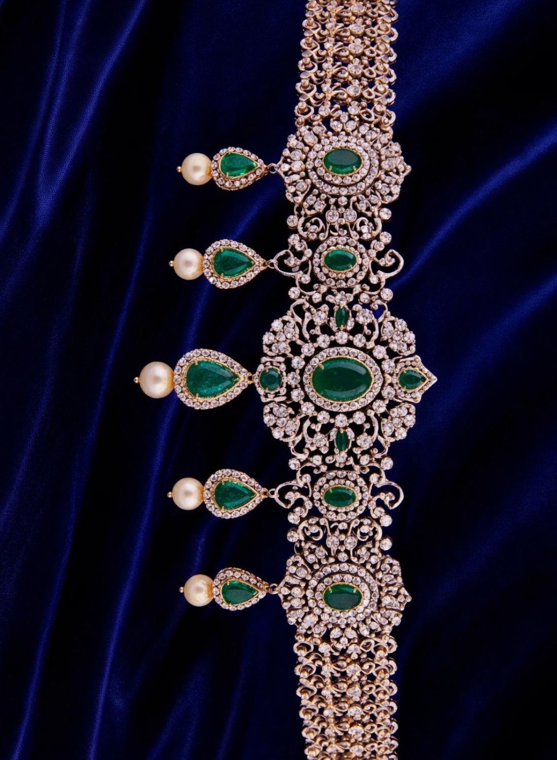 The symmetrical emerald accents across the belt enhance its royal charm, while the teardrop emerald danglers finished with luminous pearl drops create graceful movement and timeless appeal. The rich blue backdrop highlights the luxurious sparkle, making this piece ideal for grand bridal occasions.