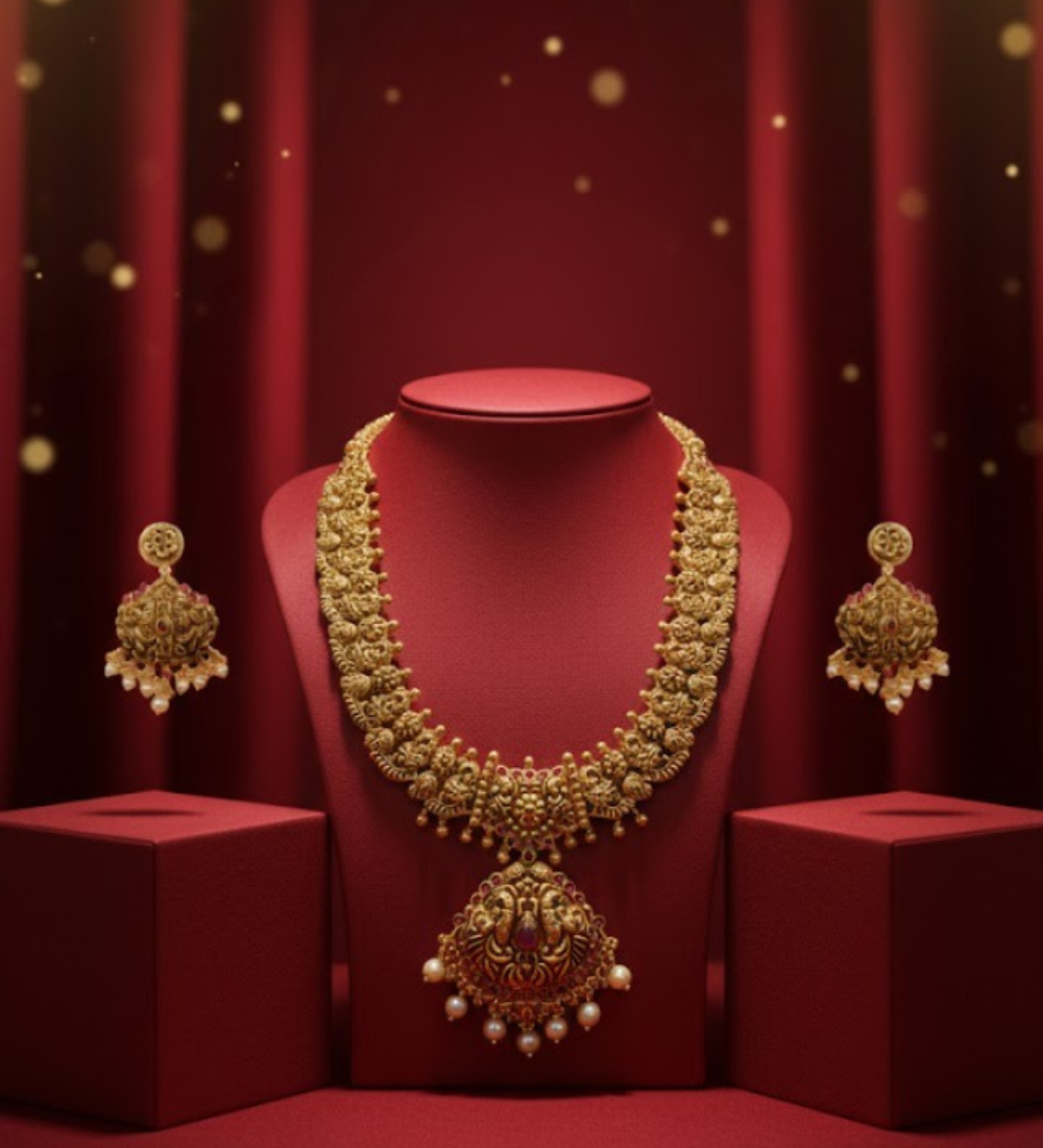 The finely crafted gold links create a graceful flow around the neckline, while the matching jhumka earrings complete the ensemble with balanced sophistication. The rich antique finish enhances every carved detail, making it an ideal choice for weddings, festive gatherings, and sacred celebrations.