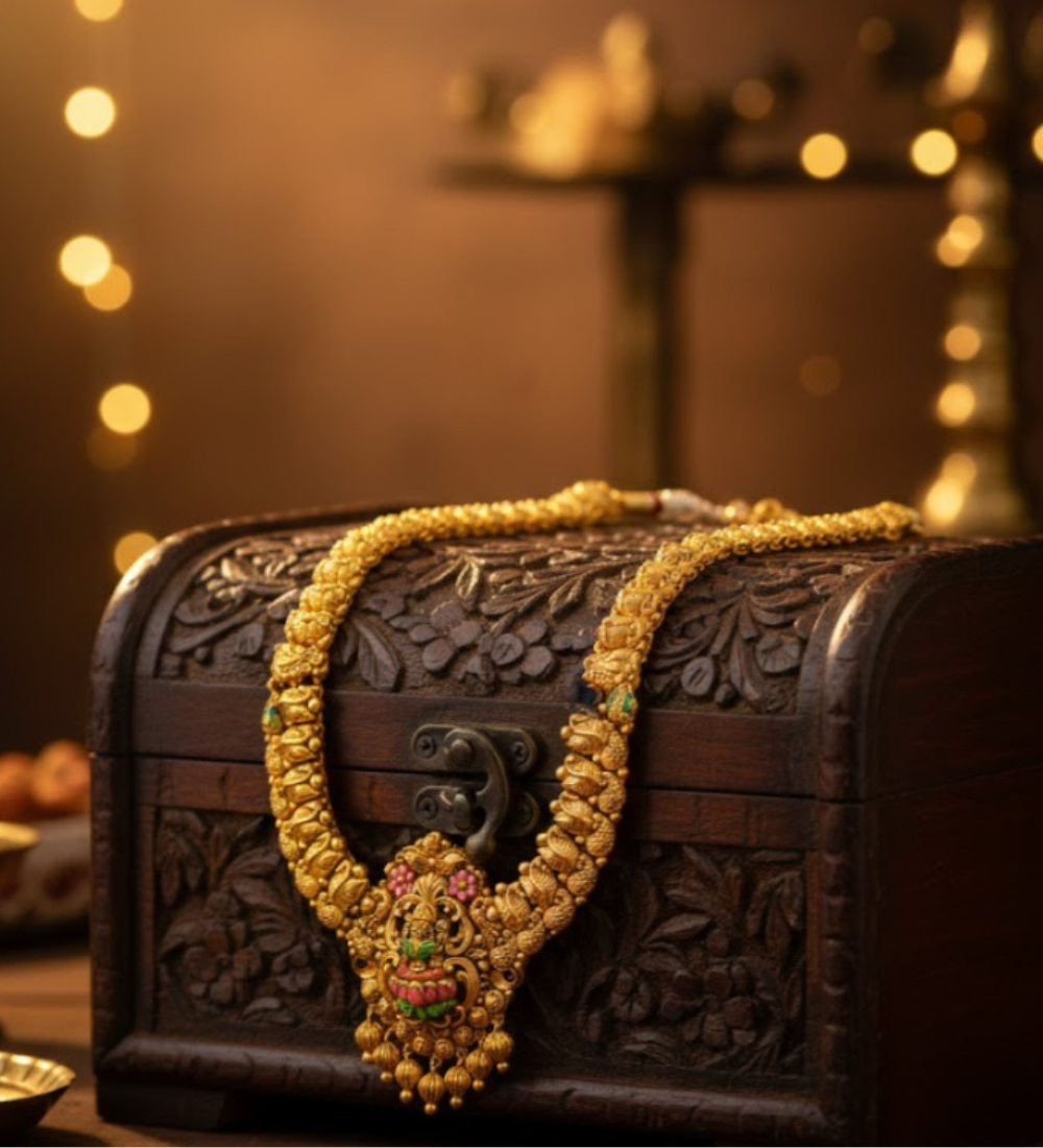 An exquisite celebration of temple heritage, the Royal Gajalakshmi Heritage Gold Necklace is a masterpiece of intricate craftsmanship. The beautifully sculpted Gajalakshmi motif at the center, adorned with vibrant ruby and emerald accents, symbolizes prosperity, strength, and divine blessings.