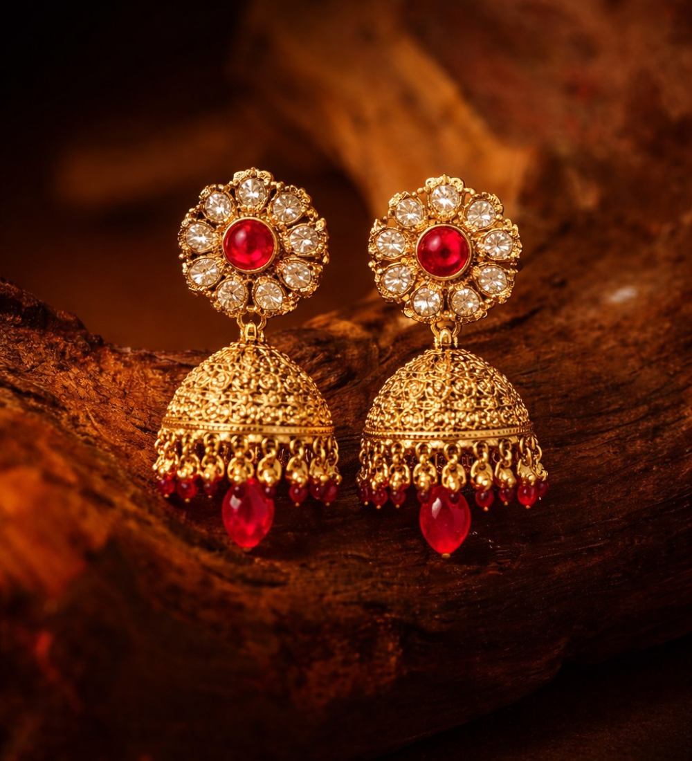 Bold, vibrant, and timeless — the Ruby Radiance Floral Gold Jhumka Earrings are designed to make a striking festive statement. The floral stud top features a rich ruby-red center stone encircled by shimmering white stones, creating a radiant bloom effect.