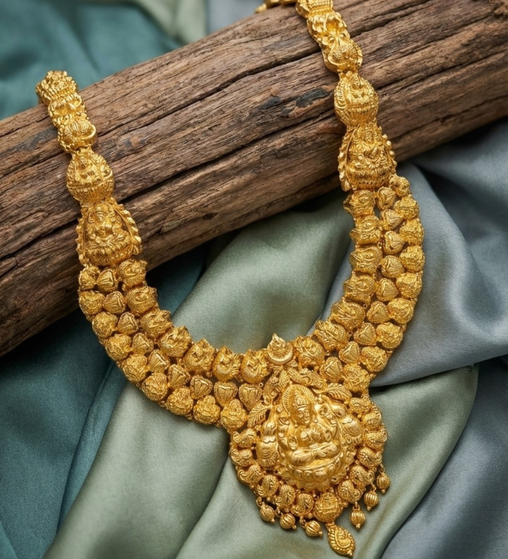 A magnificent tribute to divine artistry, the Sri Mahalakshmi Heritage Gold Temple Necklace embodies sacred elegance and timeless craftsmanship. The intricately sculpted Mahalakshmi pendant is surrounded by detailed traditional motifs and textured gold elements, reflecting prosperity, grace, and cultural richness.